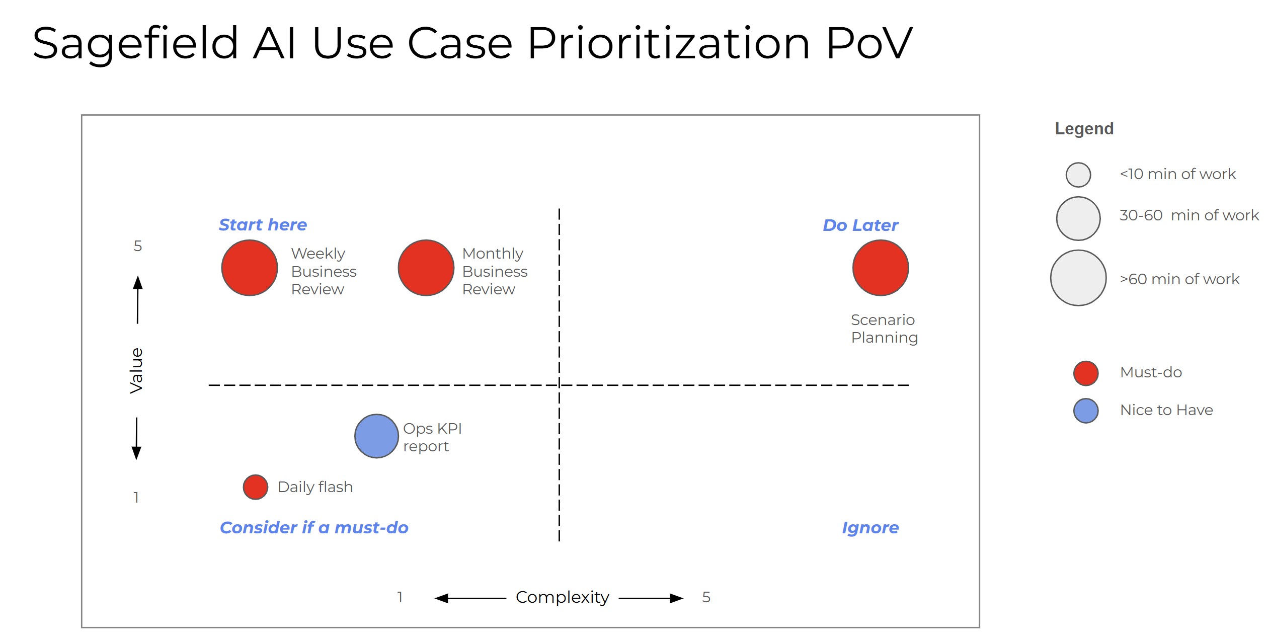 Our recommendation is to start in the upper left and tackle the 'quick-wins' first. This will generate confidence and learnings to help go after the more complex use cases